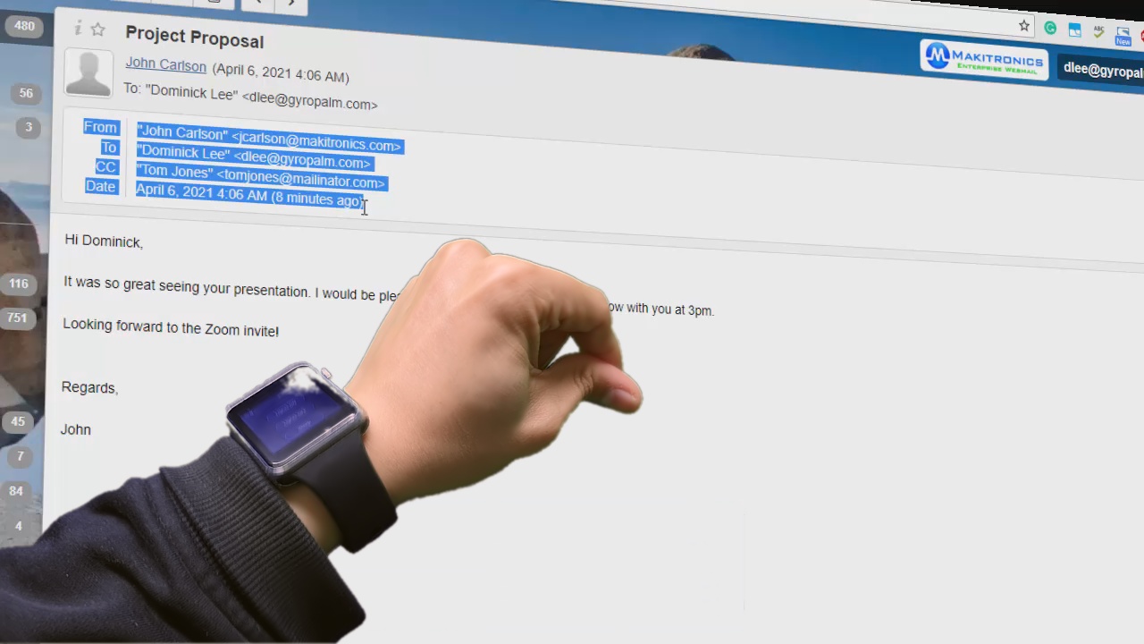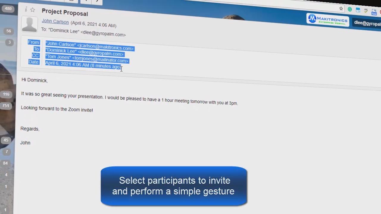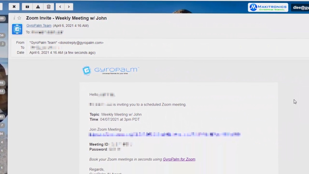 Zoom is widely used by professionals around the world. Every day, individuals spend around an hour or more planning, scheduling meetings, and dealing with emails. We understand the need for an expedited workflow that allows professionals to create meetings and send invites to guests as soon as they are needed. GyroPalm offers its wearable edge-AI technology, in combination with state-of-the-art interfaces to provide a convenient user experience.