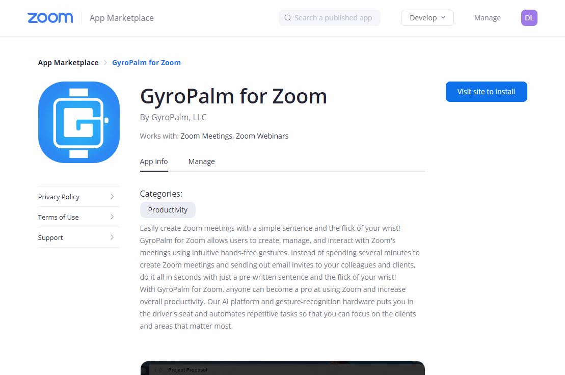 To install the app, search GyroPalm for Zoom on Zoom's Marketplace, ensure you are signed into your Zoom account, and click Visit site to install. You will be redirected to the GyroPalm platform.