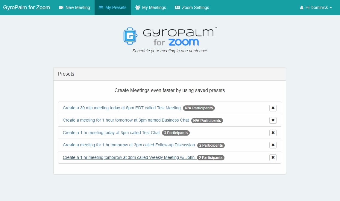 To create a meeting with a preset, click the My Presets tab and click the item in the list which you want to create a meeting from.