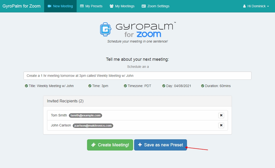 For recurring meetings, you can save your list of recipients and meeting query as a "Preset". To do that, prior to clicking the Create Meeting button, click Save as New Preset first.