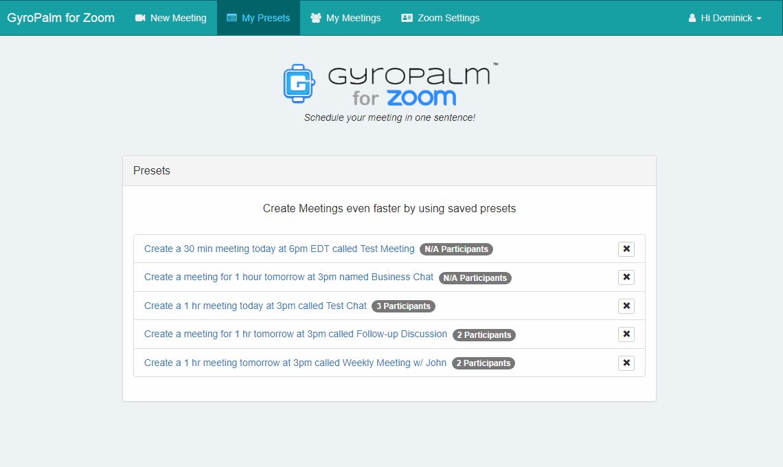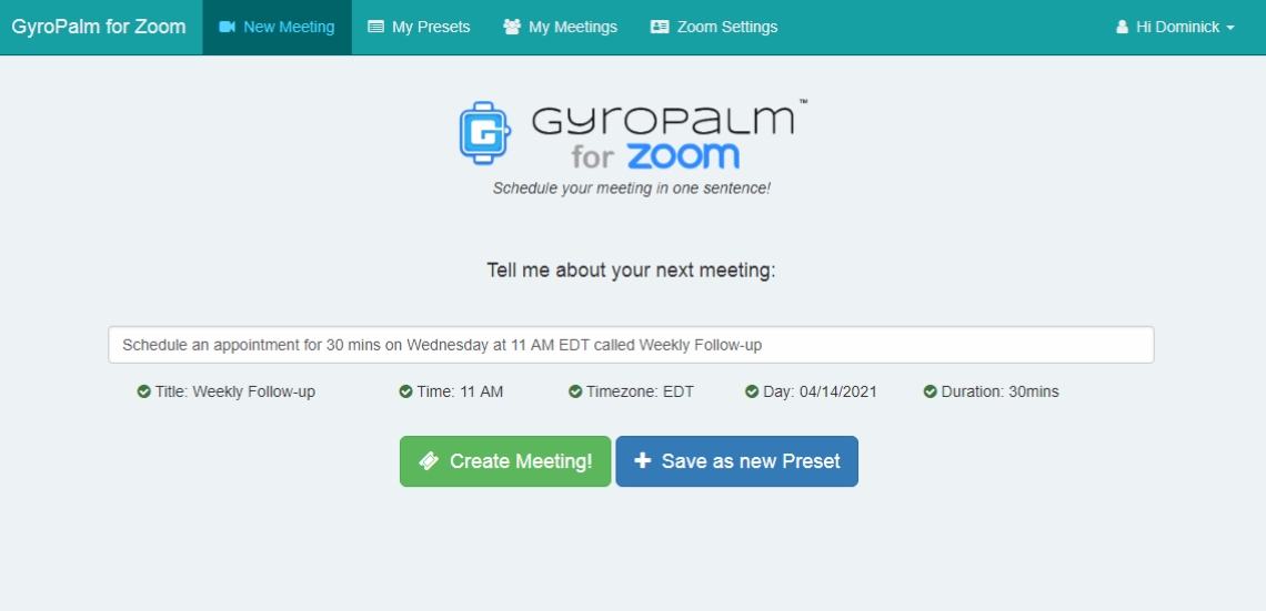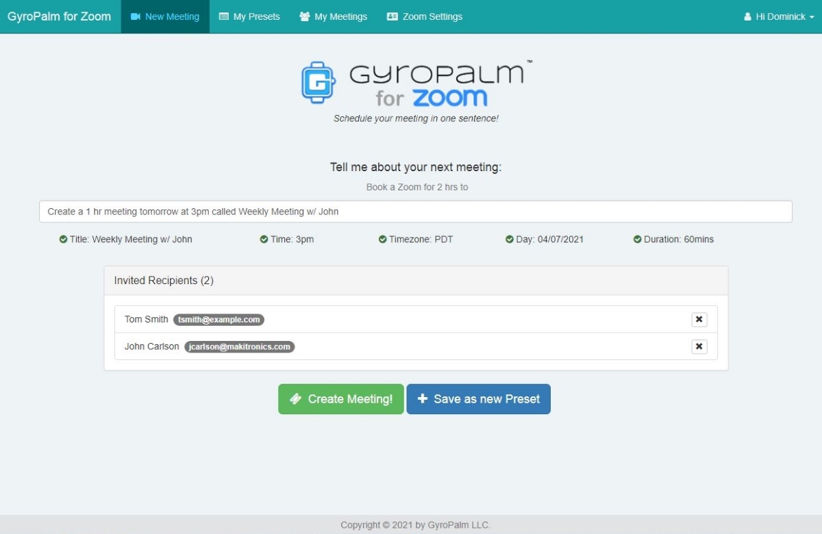 GyroPalm for Zoom (a.k.a. GyroPalm Room) is designed around Zoom users with OAuth sign-in capability. Users do not necessarily need a GyroPalm account to use this platform. Users can create Zoom meetings with one sentence and the snap of their fingers (or a keyboard hotkey). Invitation emails to participants are automatically created by our platform and sent out (one person at a time) on the user's behalf. Presets can be saved for future recurring meetings. Schedule conflict functionality alerts user prior to booking a meeting. Maximize your efficiency with the latest patented gesture control technology combined with cutting-edge AI.