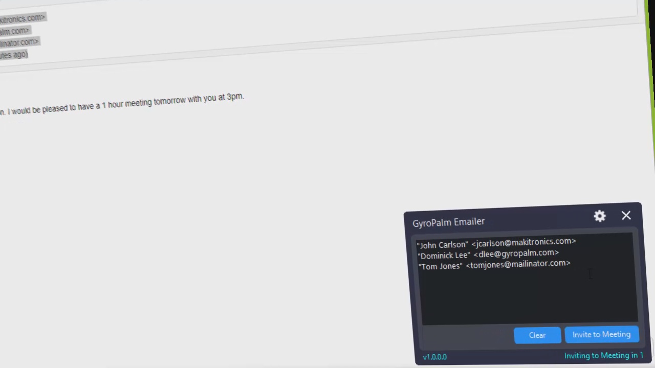GyroPalm Emailer will pop up and show you the extracted names and emails of the recipients. Within seconds, the platform with redirect you to a page where you can finish creating your meeting. If you see a typo or error in the email text, click on the text area, edit your text, and click the Invite to Meeting button to proceed.